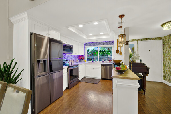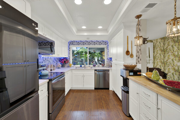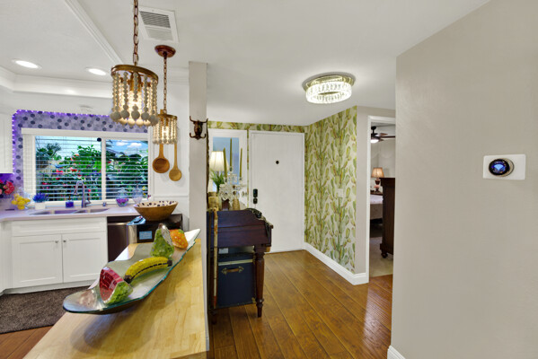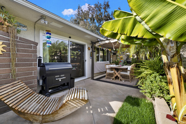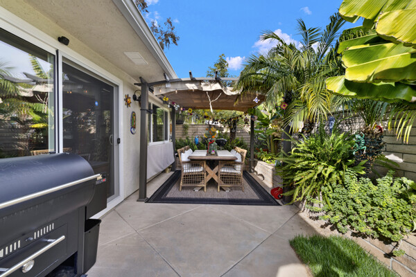 New aluminum double-pane windows and sliding glass doors enhance energy efficiency and natural light. Newer distressed hardwood laminate flooring flows seamlessly through the kitchen and living areas, adding warmth and sophistication. Electrical upgrades include new outlets, switches, and enhanced lighting throughout the home. Enjoy serene outdoor living with a removable backyard pergola adorned with lights, perfect for entertaining. Both bathrooms now feature extra-large, LED-lit, anti-fog vanity mirrors for a spa-like experience.
